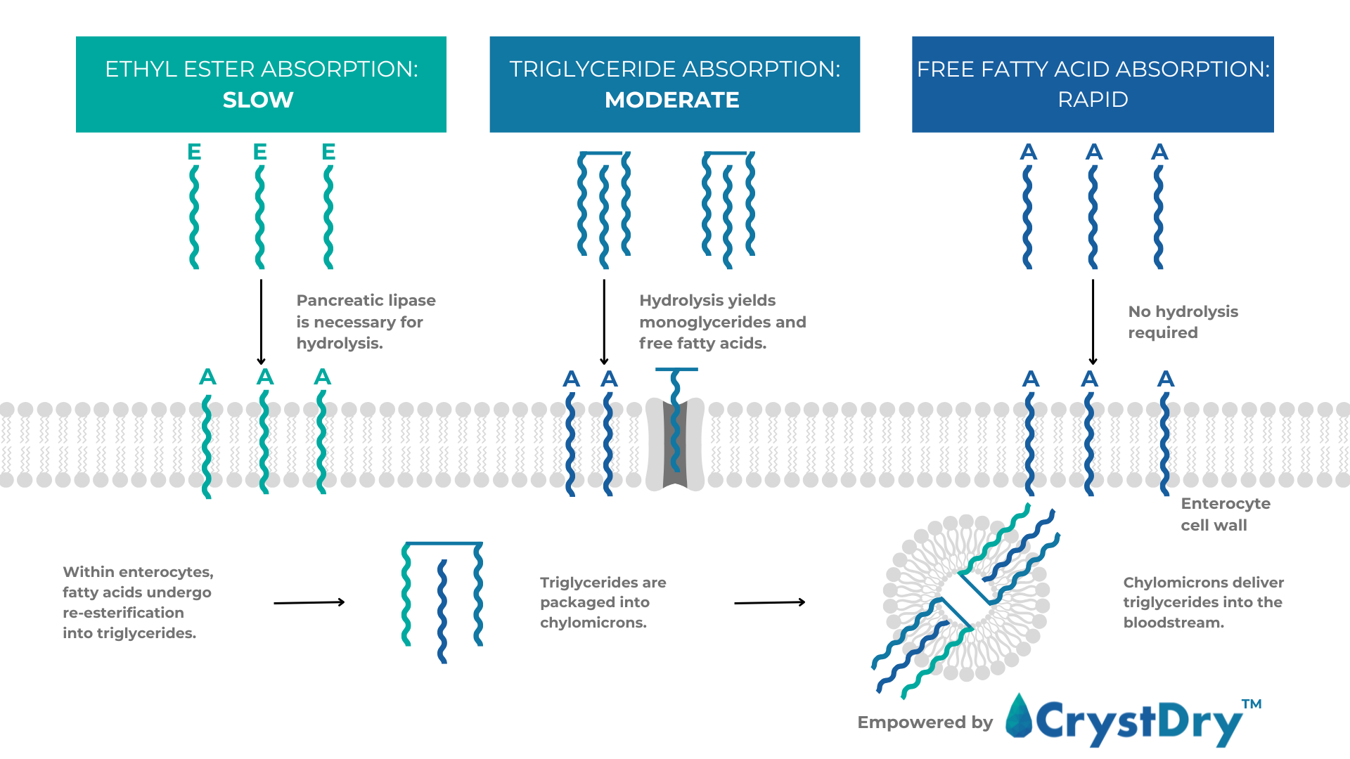 Moreover, CrystDry™ innovatively delivers DHA in a free fatty acid (FFA) form, which requires no enzymatic hydrolysis for absorption, ensuring 76% higher bioavailability. This optimized delivery system allows DHA to be absorbed directly through cell membranes, dramatically improving efficiency and effectiveness. By combining unparalleled DHA purity, superior absorption, and additive-free formulation, CrystDry™ offers manufacturers a competitive edge in creating next-generation Omega-rich products.